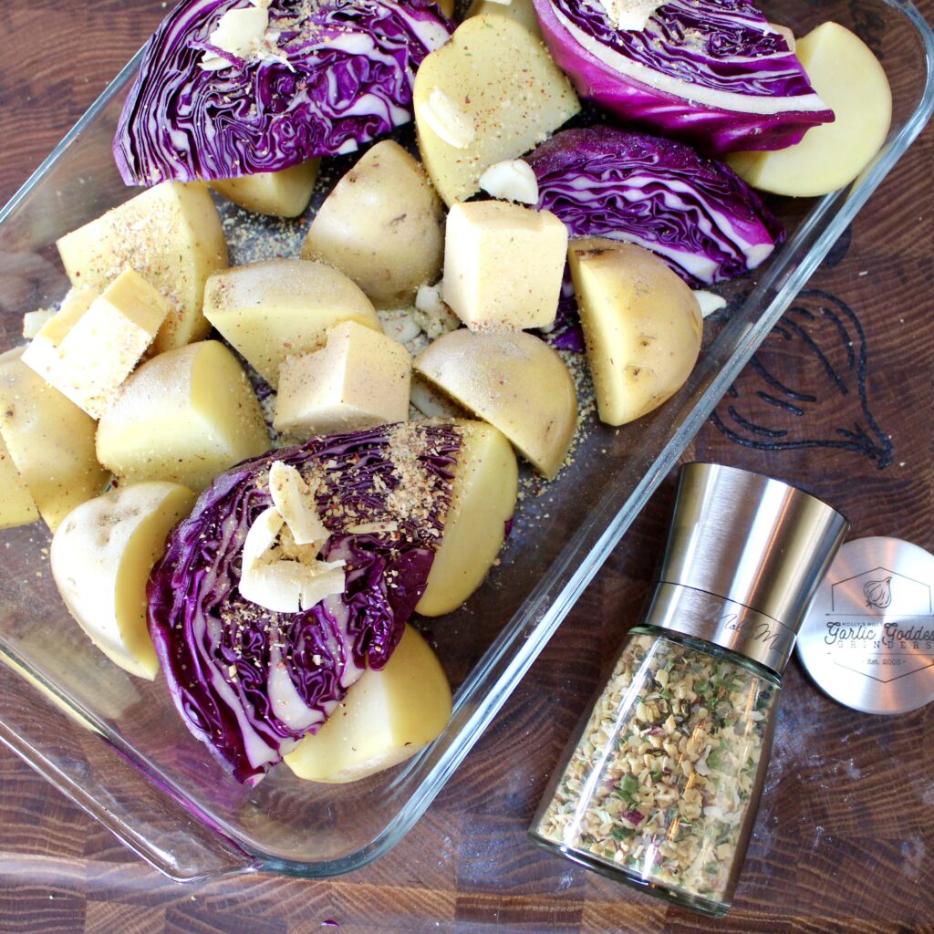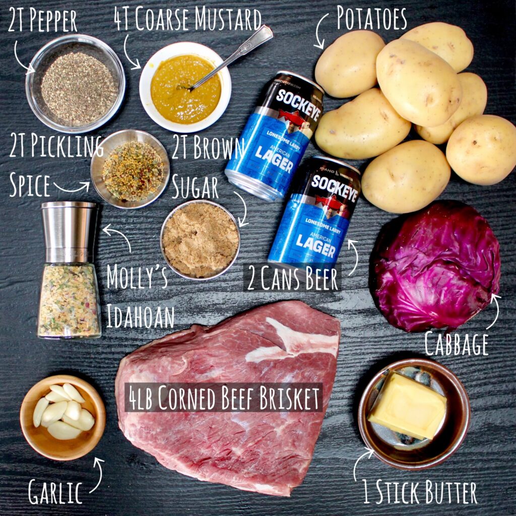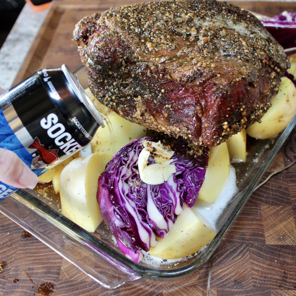 Step 3: When corned beef reaches about 145°F, preheat your oven to 350°F. Throw all the ingredients for the braise in a large oven safe dish including the cabbage and potatoes. Season everything with the Idahoan blend. Place the meat on top of the cabbage and potatoes and cook in the oven for 1 hour. About 30 minutes in, stir around the potatoes and cabbage to make sure everything is coated with the beer and butter mix.